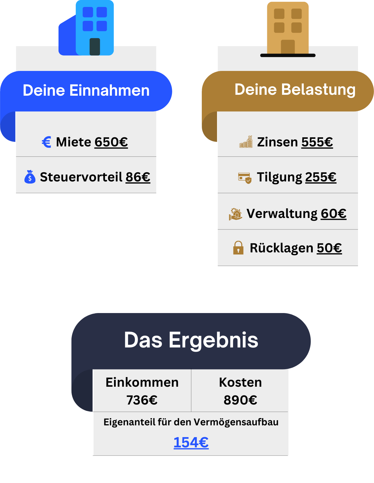 Weniger als Du denkst. In unserem Beispiel (Kaufpreis 180.000 €, 3,7 % Zins, 1,5 % Tilgung) tragen Miete 650 € und Steuervorteile 86 € den Großteil der Kosten.